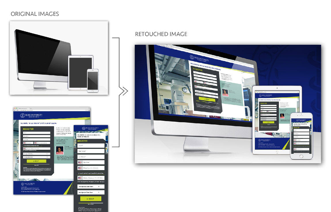 Corrections Made: inserted webpages on bottom left info screens of devices on top left, created blue gradated background with logo,added shadows to devices