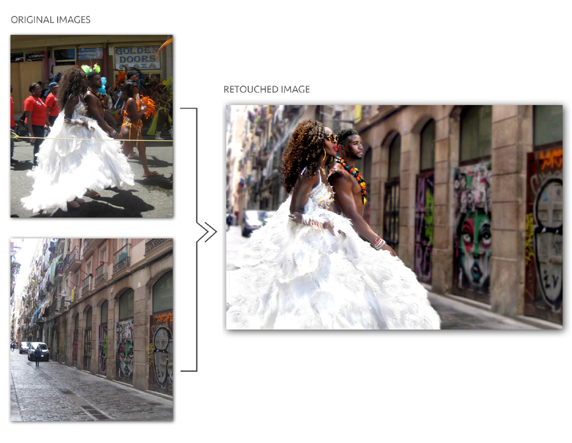 Corrections Made: silhouetted out main couple in top left image and placed them into bottom left image, adjusted saturation of woman’s lipstick and blush,adjusted saturation all accessories worn by couple,increased saturation of street art on walls in bottom left image,added blur to bottom left image so it functions as the background,added motion blur to the couple,adjusted the lighting in both images