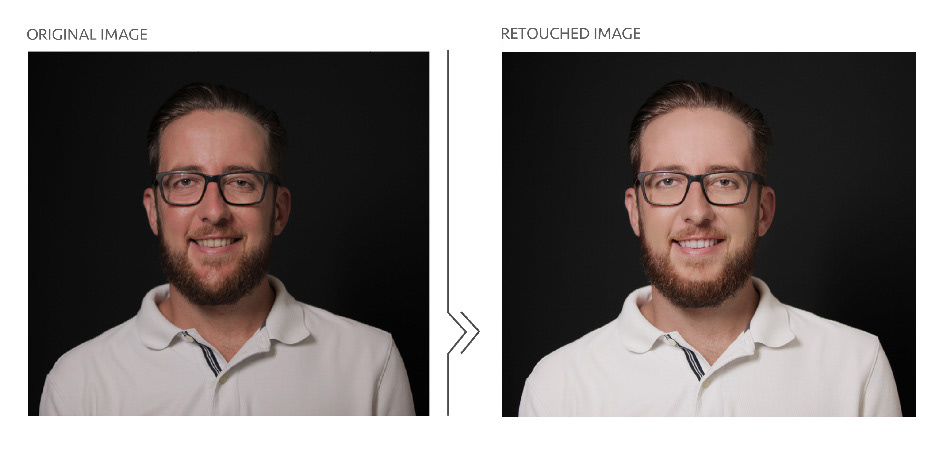 Corrections Made: removed blemishes, adjusted complexion redness,whitened teeth added facial hair placed to soften "V" shape in beard on chin, adjusted angle of right eye